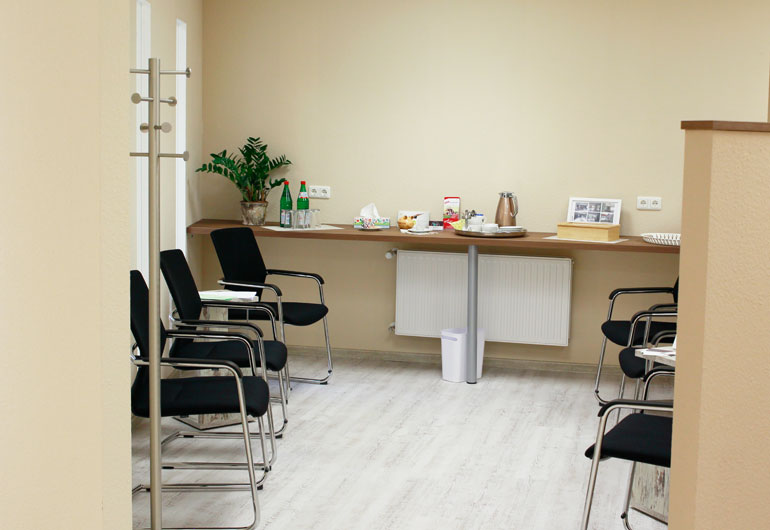 Bereits der Empfangsbereich ist groß, freundlich und hell gehalten, damit Sie sich direkt beim Betreten unserer Praxisräume gut aufgehoben fühlen. Sollten Sie einige Augenblicke warten müssen, so können Sie dies bei uns ebenfalls in einem gemütlichen und freundlichen Umfeld tun.